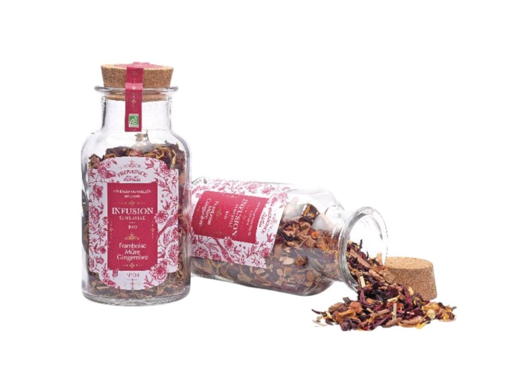 Citrónová tráva*, Prírodná malinová príchuť*, Bio stévia*, Nechtík lekársky*, Malina*. **100 % ingrediencií pochádza z ekologického poľnohospodárstva.